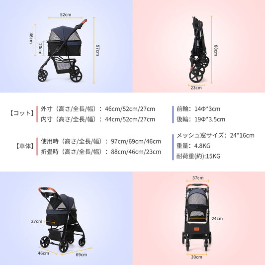 Aikenn 犬用ベビーカー 小型犬 折り畳み ペットキャリーカート ペットバギーミニ 4輪タイプ 犬介護用 猫犬兼用 前輪360°回転 後輪ブレーキ付 飛び出し防止 軽量 ワンタッチ開閉 組み立て簡単 耐荷重15KG 犬用おでかけ用品 (ブルー+ブラック)