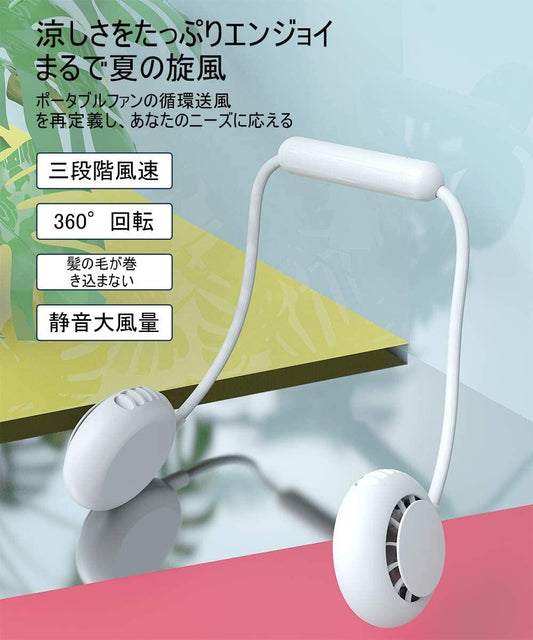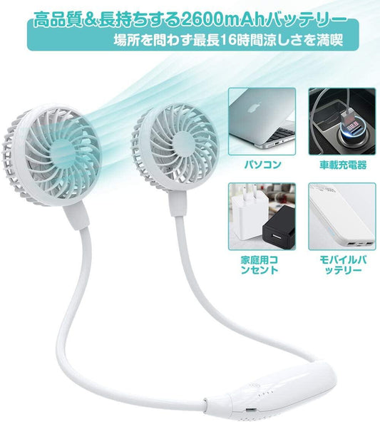 PONSING 首掛け扇風機 ミニ扇風機 携帯扇風機 大風量 2600mAh 大容量 収納便利 ハンズフリー USB充電式 強力 6時間連続使用 3段階調節 14枚羽根 360°角度調整