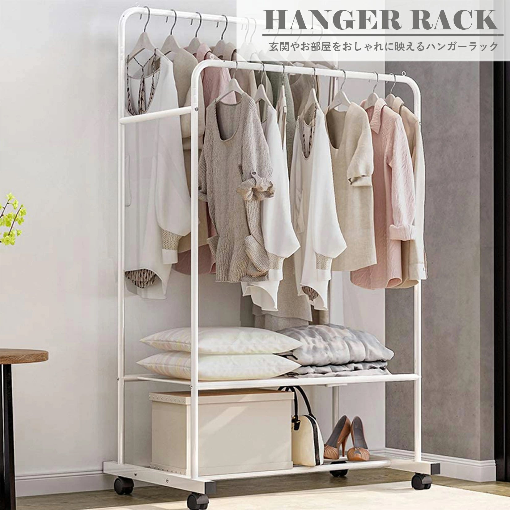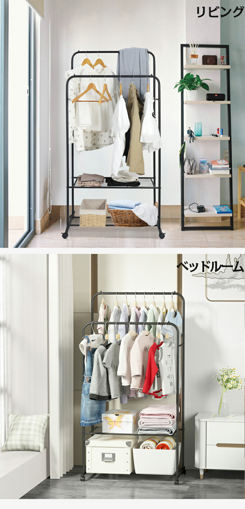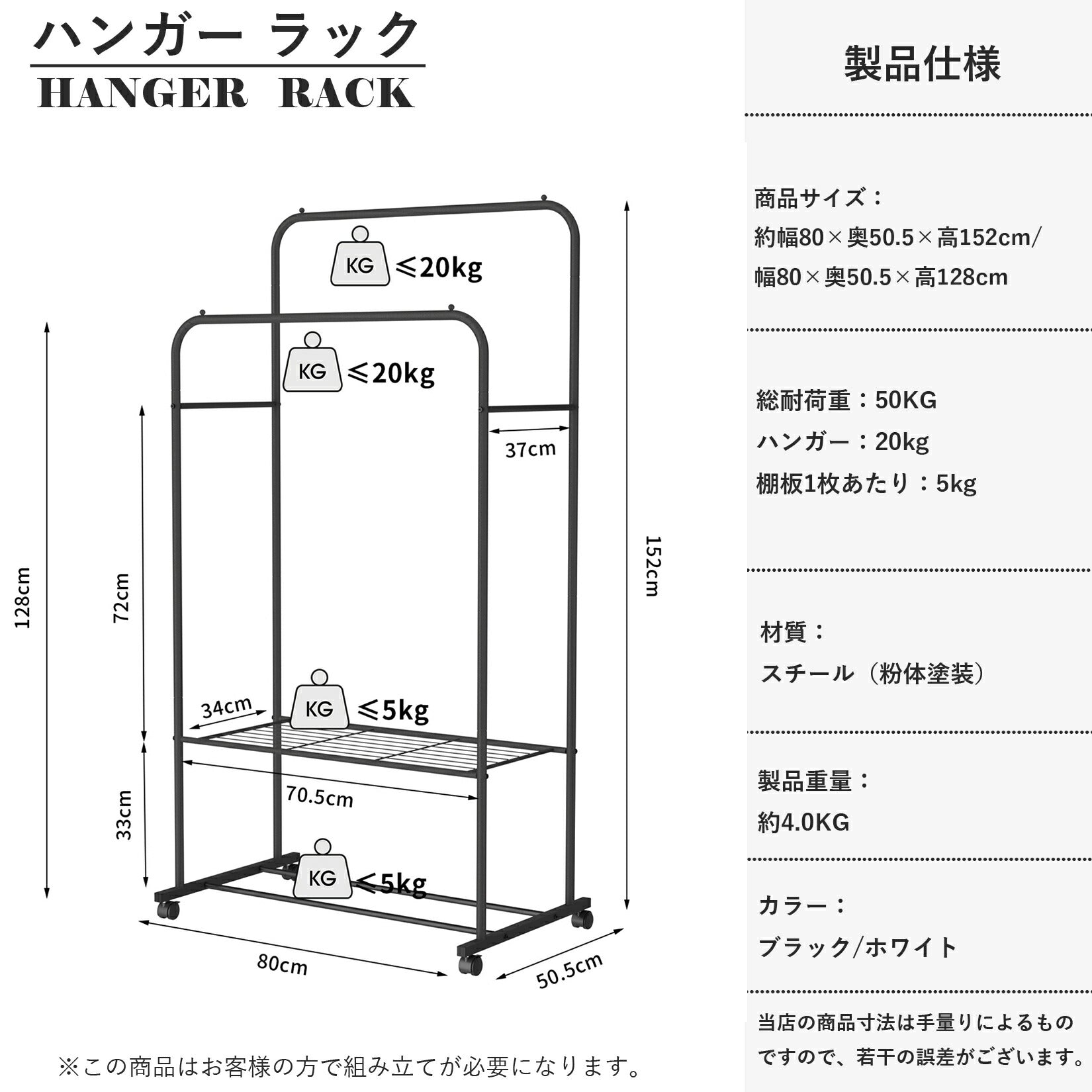 ダブル ハンガーラック 2段 幅80 キャスター付き 2段棚付き パイプハンガーラック 洋服掛け コート掛け 収納ラック 組立簡単 防サビ 防水 耐腐食性 ホワイト ブラック 洋服ラック 丈夫 クローゼット 服収納 部屋干し