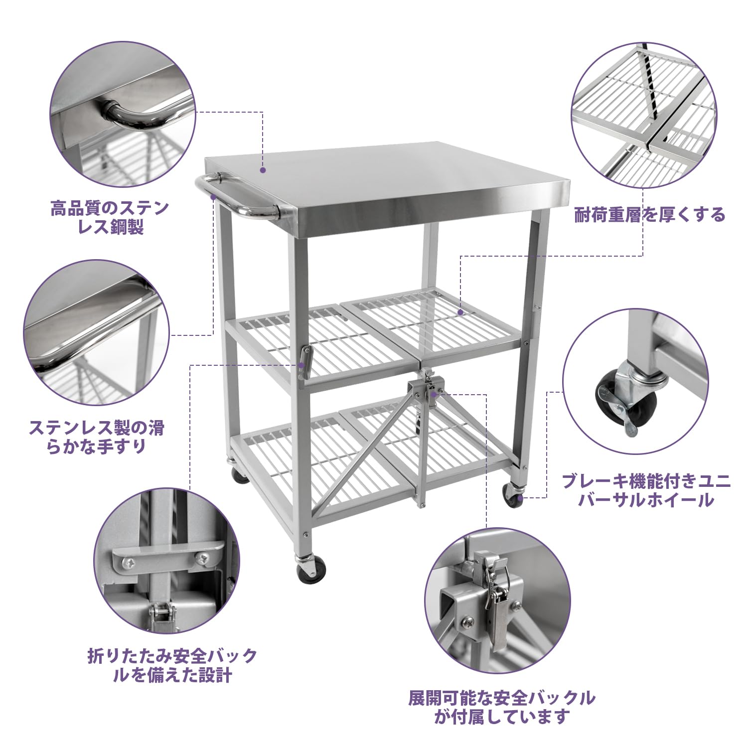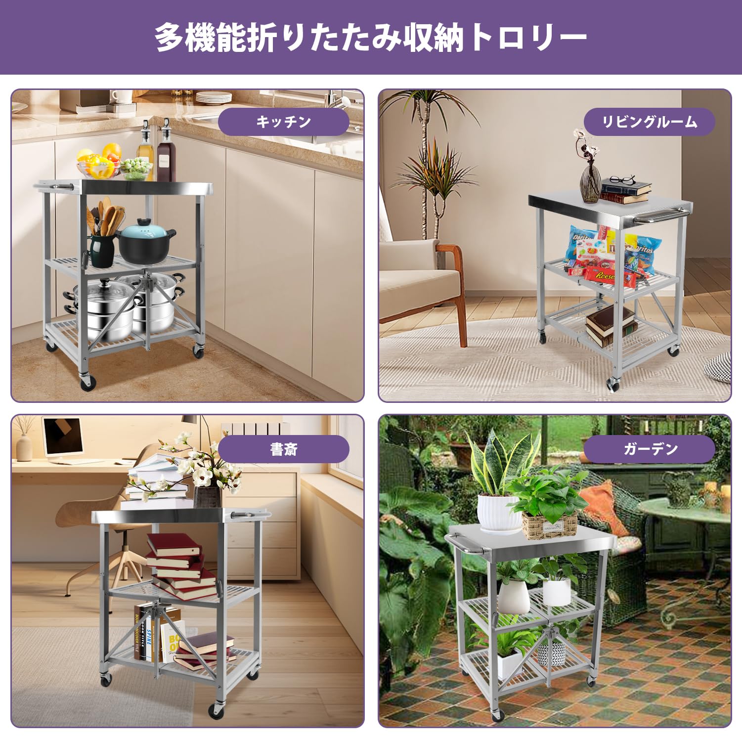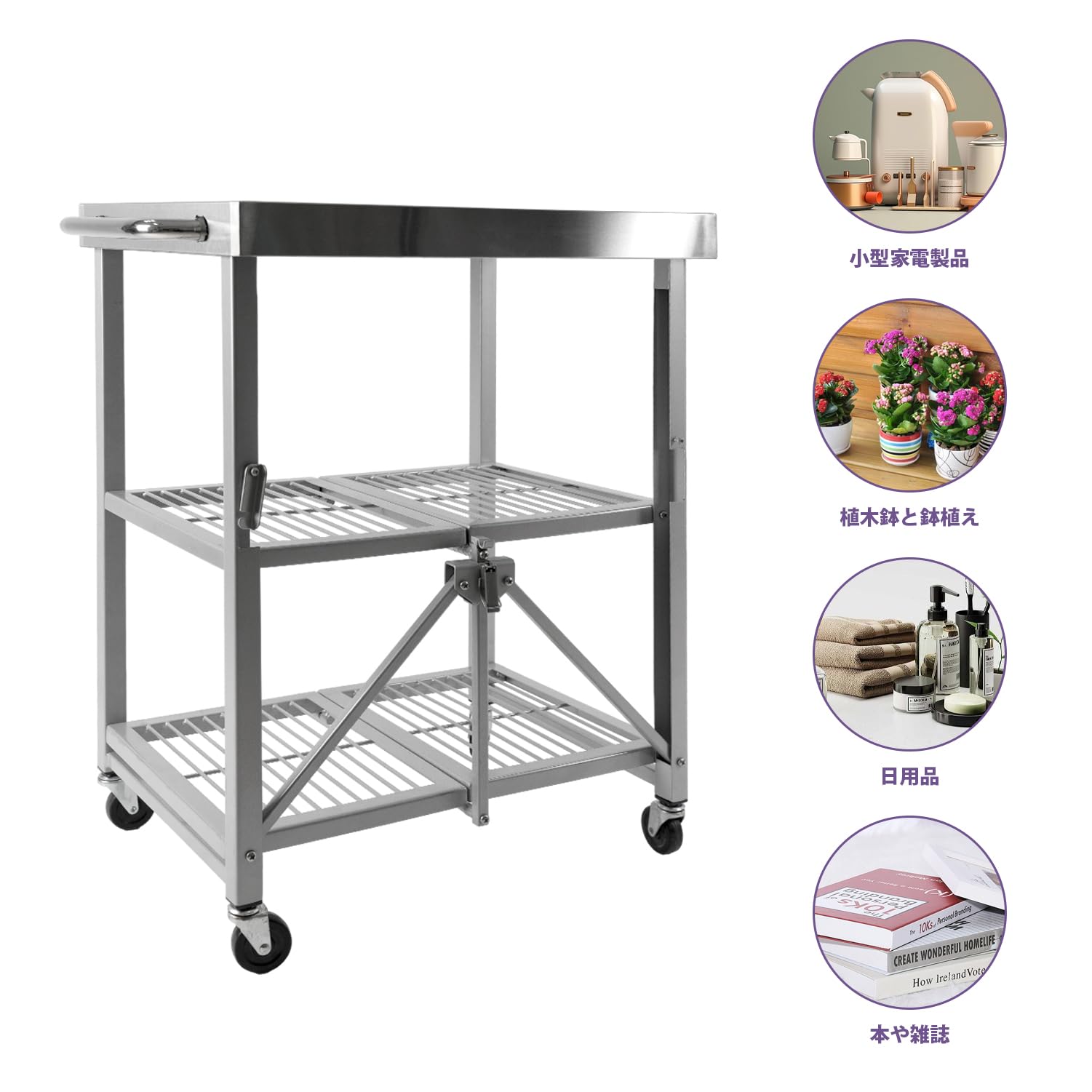 Orealauto 3段 収納ト 折りたたみ式キッチンカート 車輪付き 3段 折りたたみ式ローリングカート 商用グレード 金属製 ステンレススチールデザイン シェフ用 アウトドアフード準備カート 防錆 収納カート バスケットトローリー キャスターワゴン メタルラック 移動式 キャスター付き 収納ラック トロリー ワゴン サービスワゴン 器械台電子レンジ棚 50*66*91cm