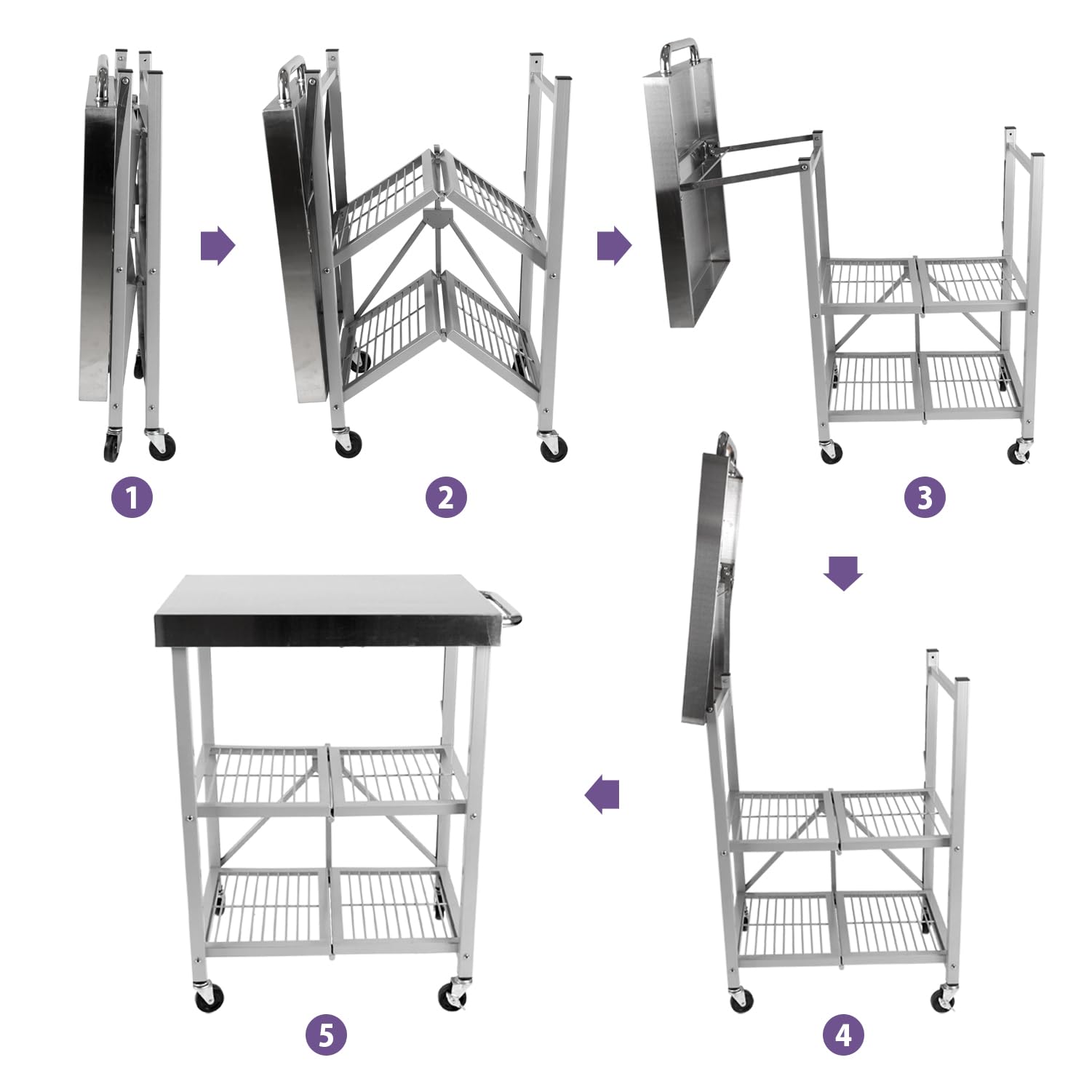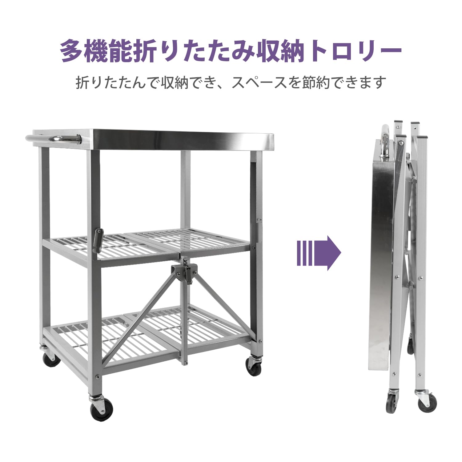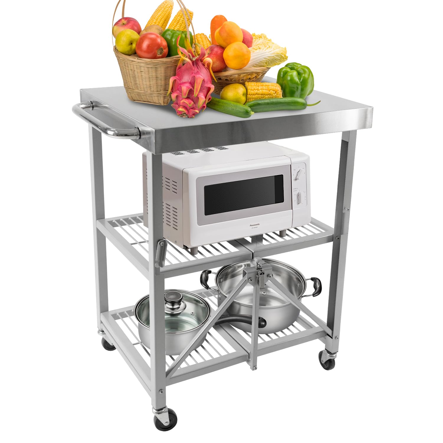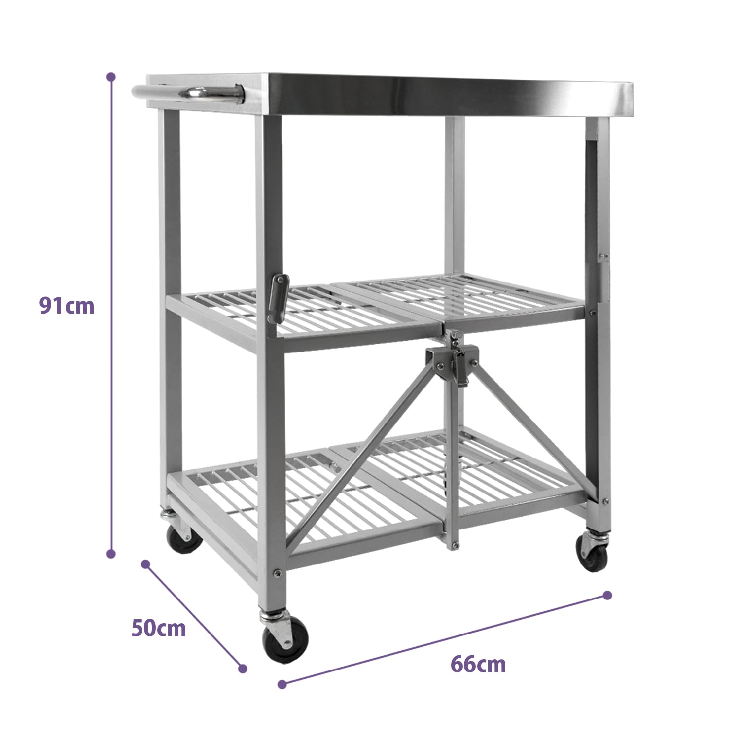Orealauto 3段 収納ト 折りたたみ式キッチンカート 車輪付き 3段 折りたたみ式ローリングカート 商用グレード 金属製 ステンレススチールデザイン シェフ用 アウトドアフード準備カート 防錆 収納カート バスケットトローリー キャスターワゴン メタルラック 移動式 キャスター付き 収納ラック トロリー ワゴン サービスワゴン 器械台電子レンジ棚 50*66*91cm